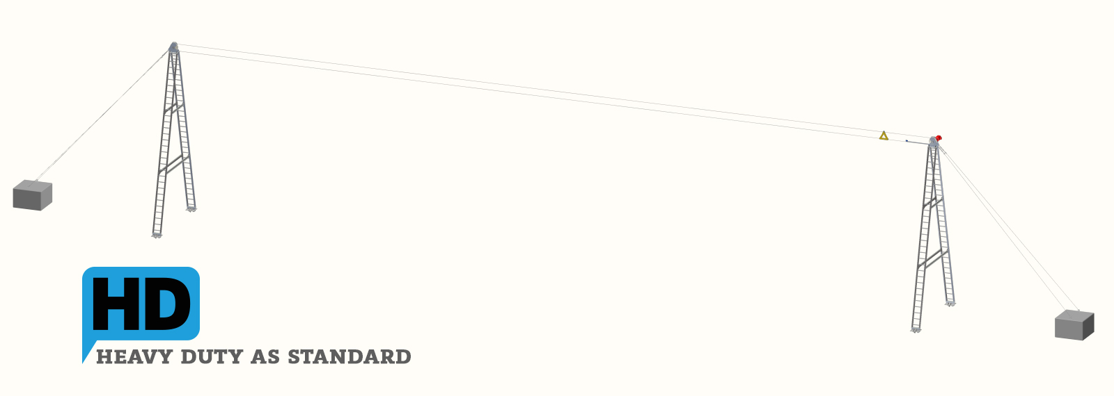 Every structural component is hot-dip galvanized to ISO 1461. No paint that chips, no rust that creeps. Our 9.3-metre A-frame towers and carrier units are built to survive salt air, UV, and years of heavy use.